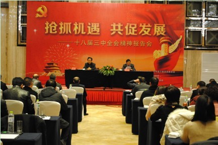 为深刻领会十八届三中全会的精神实质和丰富内涵,深入贯彻党的十八届三中全会精神,在更高层次上推动我县民营经济健康发展,县工商局、县民营企业协会联合县内六大行业协会于2月13日在玉环福朋喜来登酒店举办十八届三中全会精神报告会。邀请到温岭市委宣传部副部长、台州市电视台资深评论员慕毅飞,作《十八届三中全会精神》专题报告,工商局中层以上领导和各协会理事160多人参加听讲。