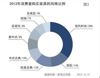 因此,从2013消费者购买家具的风格比例中,我们预测了明年可能出现的家具消费情况之一:现代时尚风格家具还将持续走俏。