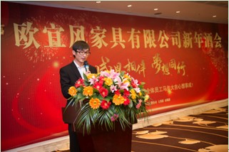 新年酒会上,全体员工聆听了公司总经理黄福青激情洋溢的致辞。黄总说:“公司的振兴,离不开员工们的辛勤劳动,努力工作;公司的发展壮大,公司的每一块奖牌、每一份荣誉都是全体员工用勤劳的双手创造出来的!正是因为有这些可敬可爱的员工不畏艰苦、顽强拼搏,才铸就了欧宜风今日的辉煌。”黄总希望今天受表彰的各类先进要珍惜荣誉,继续发挥表率和带头作用,开拓进取,勇于奉献,在各自的岗位上为公司新的大发展再创佳绩;也希望全体员工以先进模范人物为榜样,向他们学习,勤奋、努力、踏实地工作,爱岗敬业,尽职尽责,在各自的岗位上做出新的贡献,争当创新发展的先锋,争当生产经营的楷模,争当建功立业的标兵,以饱满的热忱和高昂的斗志为公司美好的明天努力奋斗!