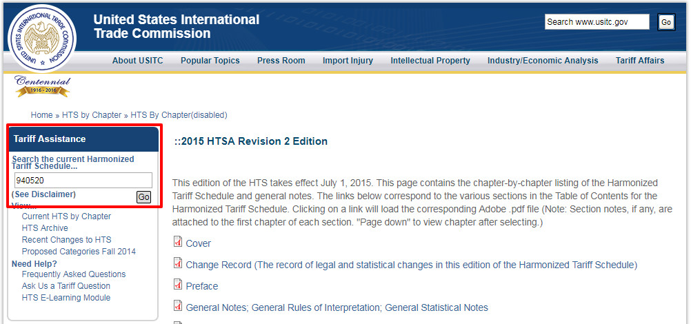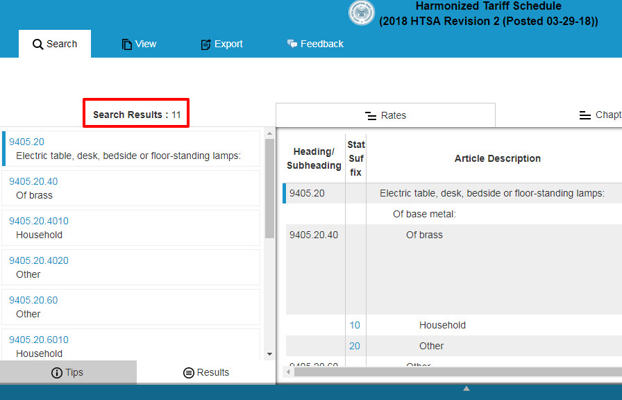 1.查询HTS CODE:进入上述网站,在Tariff Assistance项下Search the current Harmonized Tariff Schedule...下的搜索框中输入输入中国HS CODE的前六位数,如台灯940520****,搜索结果页面的左边框有详细的HTS CODE,根据自己的产品选择HTS CODE。