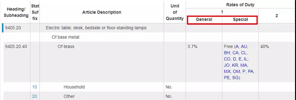 2.查询进口关税:搜索页面中Rates of Duty 1左边一栏“General”为一般进口税率,右边一栏“Special”是美国对特定国家征收的进口税率。