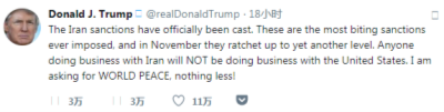这些是实施过的最严厉的制裁举措,11月还会升级到另一个层级。任何人若与伊朗做生意,就不要再跟美国做买卖。我是为了世界和平,没别的!——特朗普8月7日发表推文称。