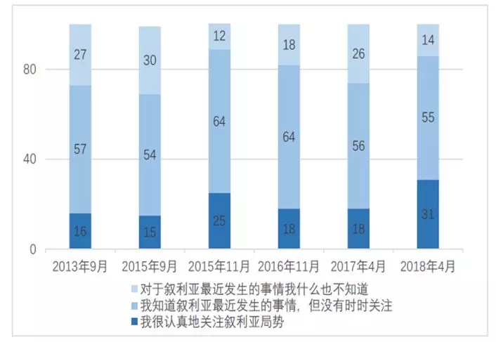 PS:2018年4月民调数据显示,认真关注叙利亚局势的民众为31%,达2013年9月以来关注度最高。在关注叙利亚局势的受访者当中,33%的民众对俄罗斯参与叙利亚战争持正面肯定的态度,30%的被访者持负面态度。