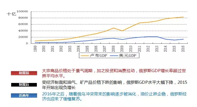2014年起,由于国际石油价格大幅下跌、卢布大幅贬值、以及欧美国家对俄罗斯实行经济制裁,导致俄罗斯经济增速持续下降。到2017 年,国际石油价格上涨。2017年俄罗斯实际GDP增速为1.5%,预计2018年经济增速将达到1.7%。