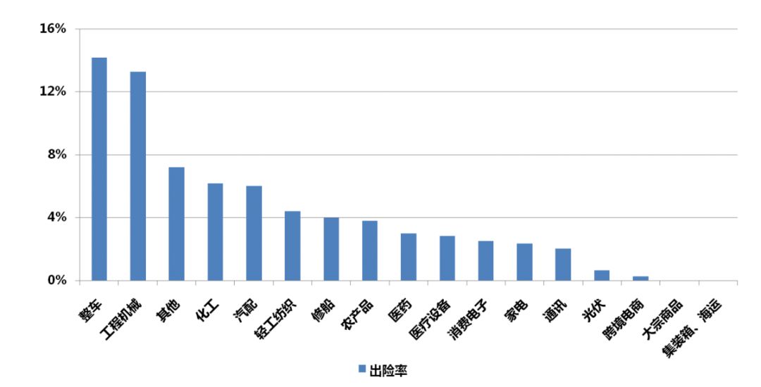 从行业的角度来看,出口到俄罗斯的能源、民生类产品普遍出险率较低,而制造业产品的出险率较高。