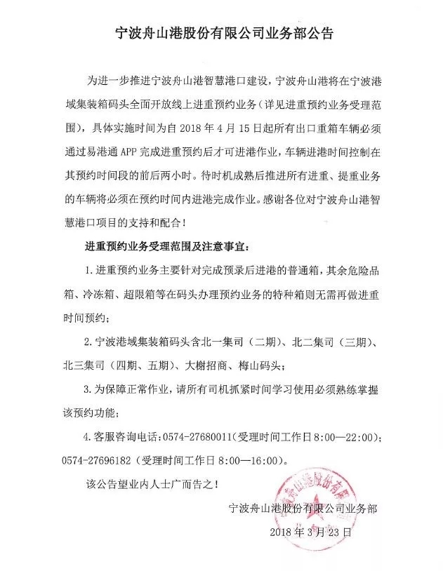 自2018年4月15日起,所有出口重箱车辆必须通过易港通APP完成进重预约后才可进港作业