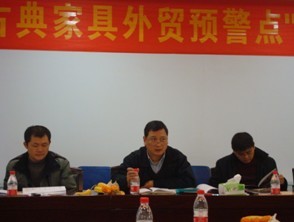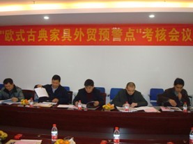 “欧式古典家具外贸预警点”考核会议在玉环商展中心召开,出席考核会议的有台州市外经贸局外贸处处长王秩亮、玉环县外经贸局副局长李振宇、外经贸局办公室副主任高震雷、县家具行业协会会长胡再贵、县家具协会秘书长林国明。