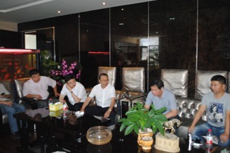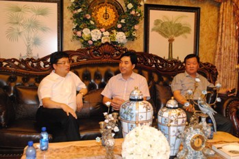 海安县副县长丁锋(左)、政协副主席储开泉(右)与欧宜风总经理黄福青(中)亲切交谈