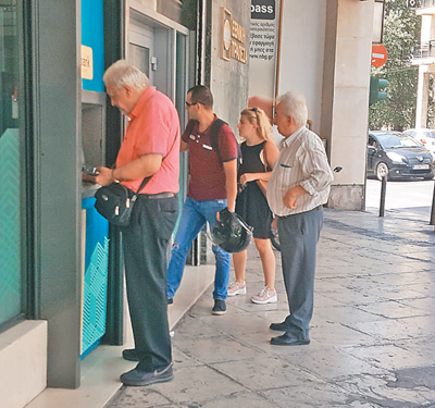 图为雅典市民正在自动取款机前排队取款。