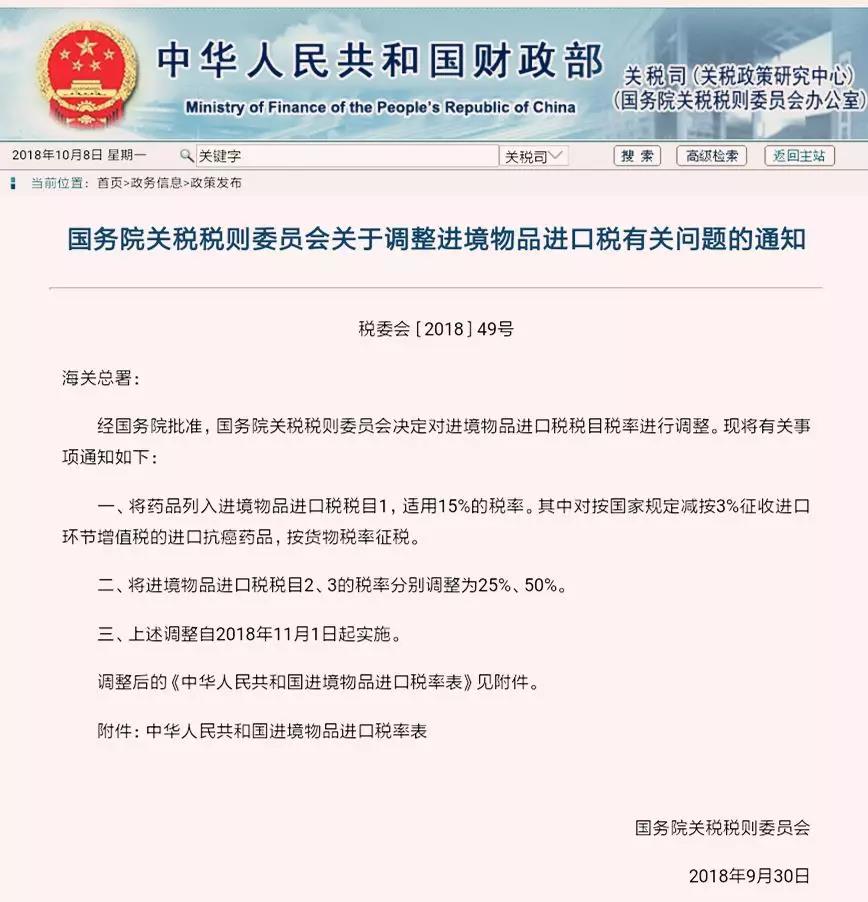 9月30日,国务院关税税则委员会发布公告,自2018年11月1日起,降低1585个税目的进口关税。此次降税涵盖了人民生产和生活所需的众多工业品等商品,平均税率由10.5%降至7.8%,平均降幅约26%。