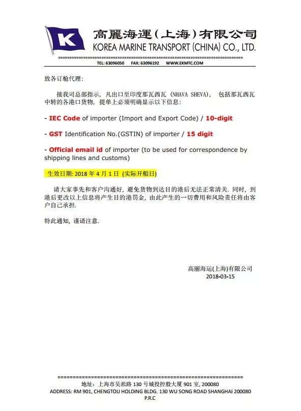 由于近日印度海关对于货物清关等有新的具体要求,KMTC发布了关于印度最新的提单要求(NHAVA SHEVA),具体通知如下: