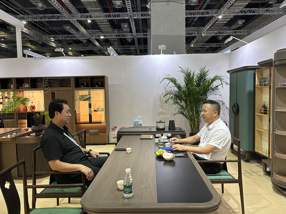 黄福青会长(右一)与原野居家具营销负责人赵崇伟(左一)交流