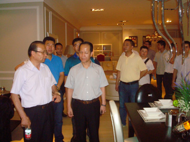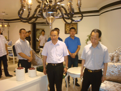 7月25日,县委书记张加波一行在楚门镇党委书记杨良强、县家具协会会长胡再贵的陪同下来到现代家具城,考察古地亚展厅。